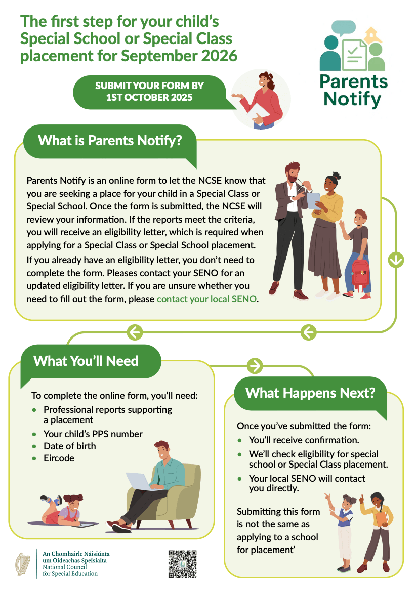 Parents/Guardians applying for a place in Our Early Intervention Class September 2026, for preschoolers with a diagnosis of Autism, you must notify the NCSE about your child by the 1st of October 2025. Please see details of NCSE NOTIFY below.